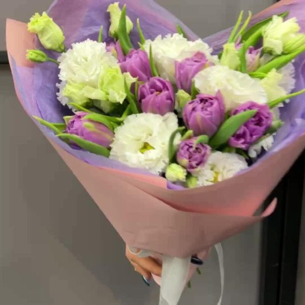 Авторский букет из пионовидных тюльпанов и эустомы от «FMART x Zvezda».Не забудьте поздравить близких с 8 марта! Подойдёт для любого повода Как ухаживать за цветами? Всё просто:1. Обновите срез букета (секатором или ножом срежьте стебли на 1 см под углом 45 градусов)2. Поставьте цветы в вазу с холодной водой ( предварительно добавив в воду средство для продления жизни срезанных цветов) 3. Меняйте воду в вазе каждый день, а срез обновляйте раз в 1-2 дня.✅ Добавляйте товар и магазин в избранное, чтобы было легче нас найти
